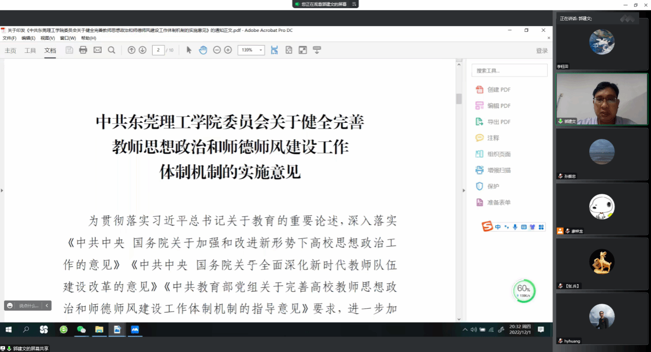 2022年12月1日,太阳城娱乐通过线上方式召开全体教职工会议,全院教职工参加会议,会议由公司党委书记郭建文主持。