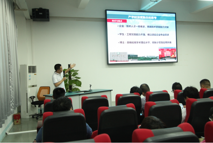 邓君老师就校企合作、人才培养、技术创新和成果转化等方面分别进行宣讲。他希望通过长安企业提供员工毕业设计题目,与高校老师共同指导毕业设计的形式,帮助员工尽快适应企业环境、提升工程实践能力。企业可以在指导员工的过程中对员工素质进行考核评估,最终促成员工留在企业服务。同时,老师也有更多机会解决企业工程技术问题,促进科研能力的提升。建立公司与企业深度融合、合作共赢的长效机制,进而促进区域经济平稳快速发展。