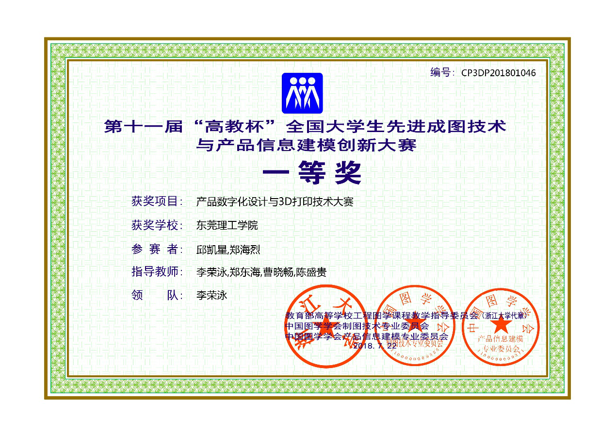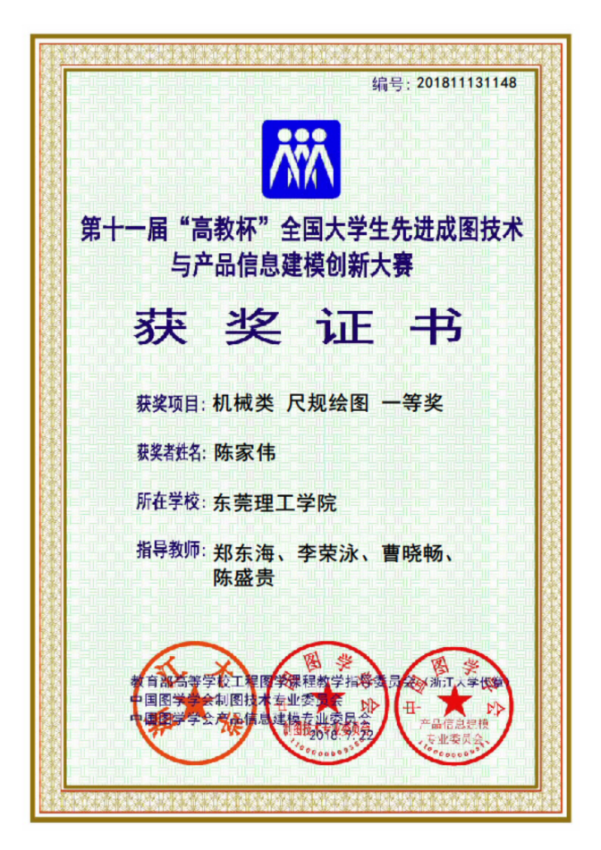 另外一个比赛,第十一届高教杯全国老员工先进成图技术与产品信息建模创新大赛于2018年7月20日至22日在江苏省南京市南京工业大学举行。该比赛吸引了北京理工大学、哈尔滨工业大学、华南理工大学等331所院校,共541个团队的3587名员工选手参赛,机械类竞赛项目包括尺规绘制零件图、三维建模及3D打印。太阳城娱乐的9位同学组成1 个团队参加了本次比赛,共获得了团体三等奖1项、个人一、二、三等奖各2项以及3D打印单项比赛一等奖。公司教师郑东海、李荣泳、曹晓畅、陈盛贵荣获优秀指导教师奖。员工具体获奖情况如下: