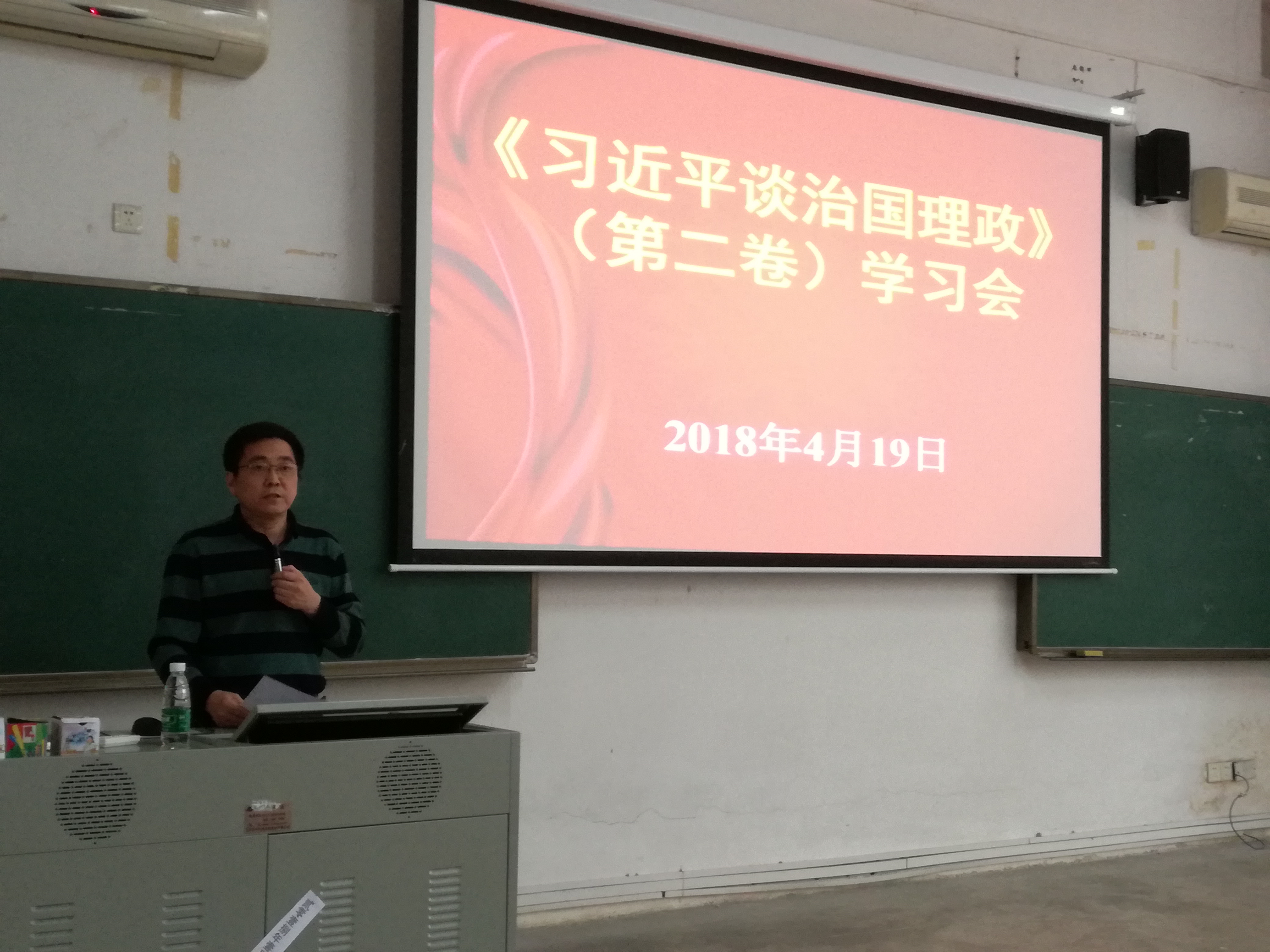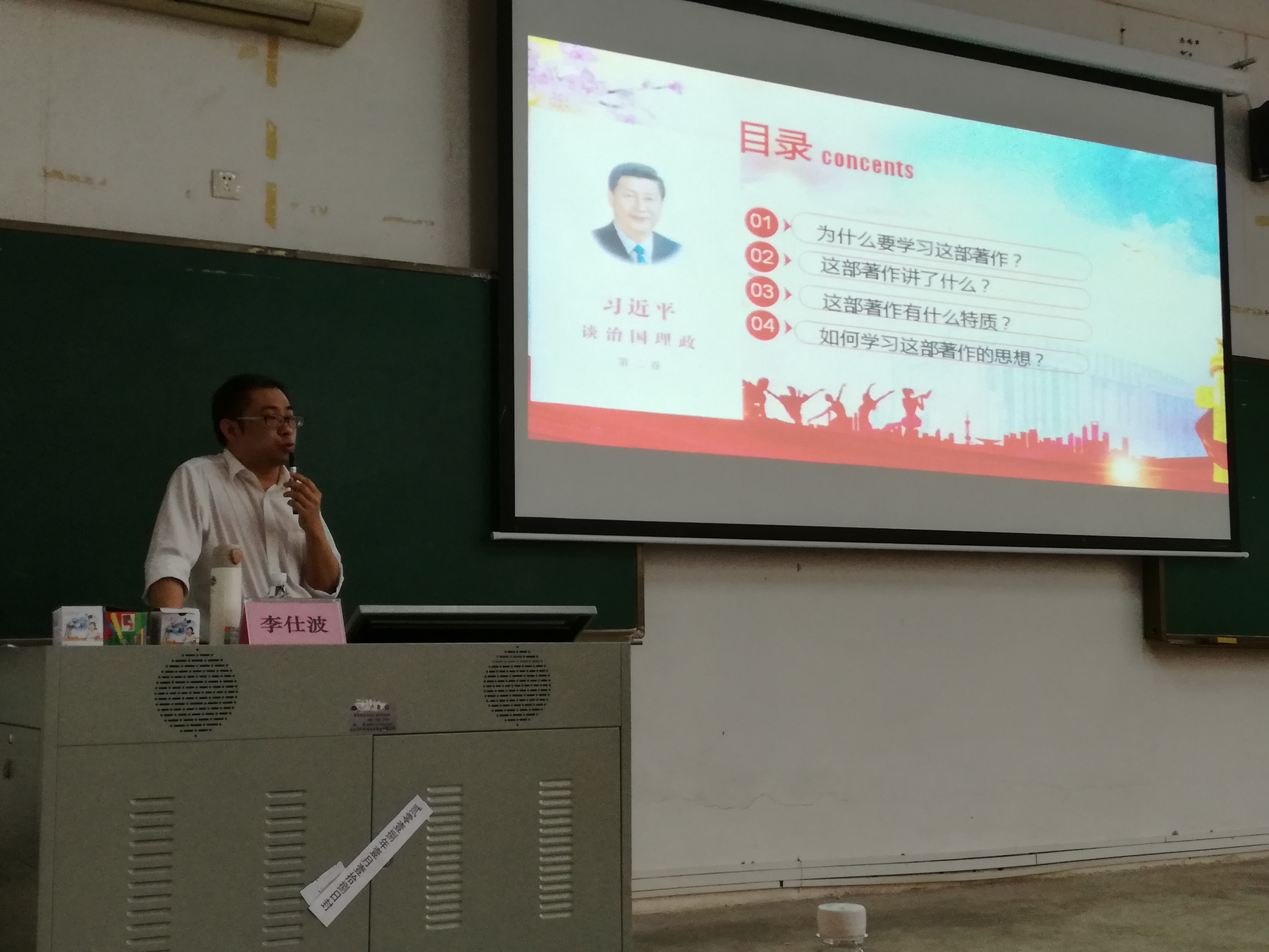 学习会上,李仕波教授首先以党的十九大及两会为背景为我们讲述了为何要学习《习近平谈治国理政》(第二卷)这本著作,同时,他指出这本著作不仅是学习领会习近平新时代中国特色社会主义思想的权威读本,更是学习掌握马克思主义中国化的最新理论成果。紧接着李教授通过十七个主题为我们讲解了本书的内容及特质,强调了该著作具有原创性、实践性指导、现代道路示范性等特性,最后他提出了我们结合实际,带头认真系统地学习该著作的思想。