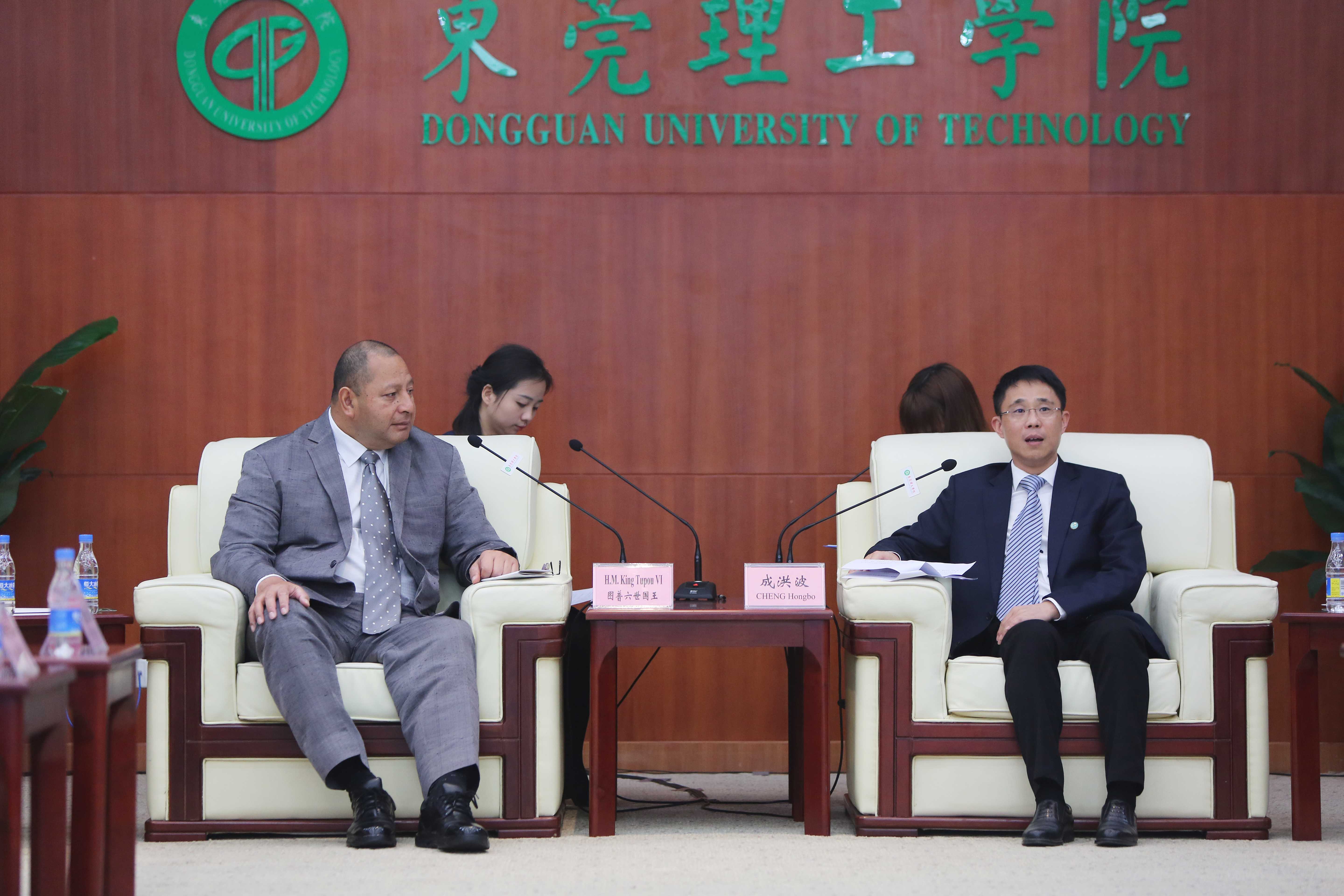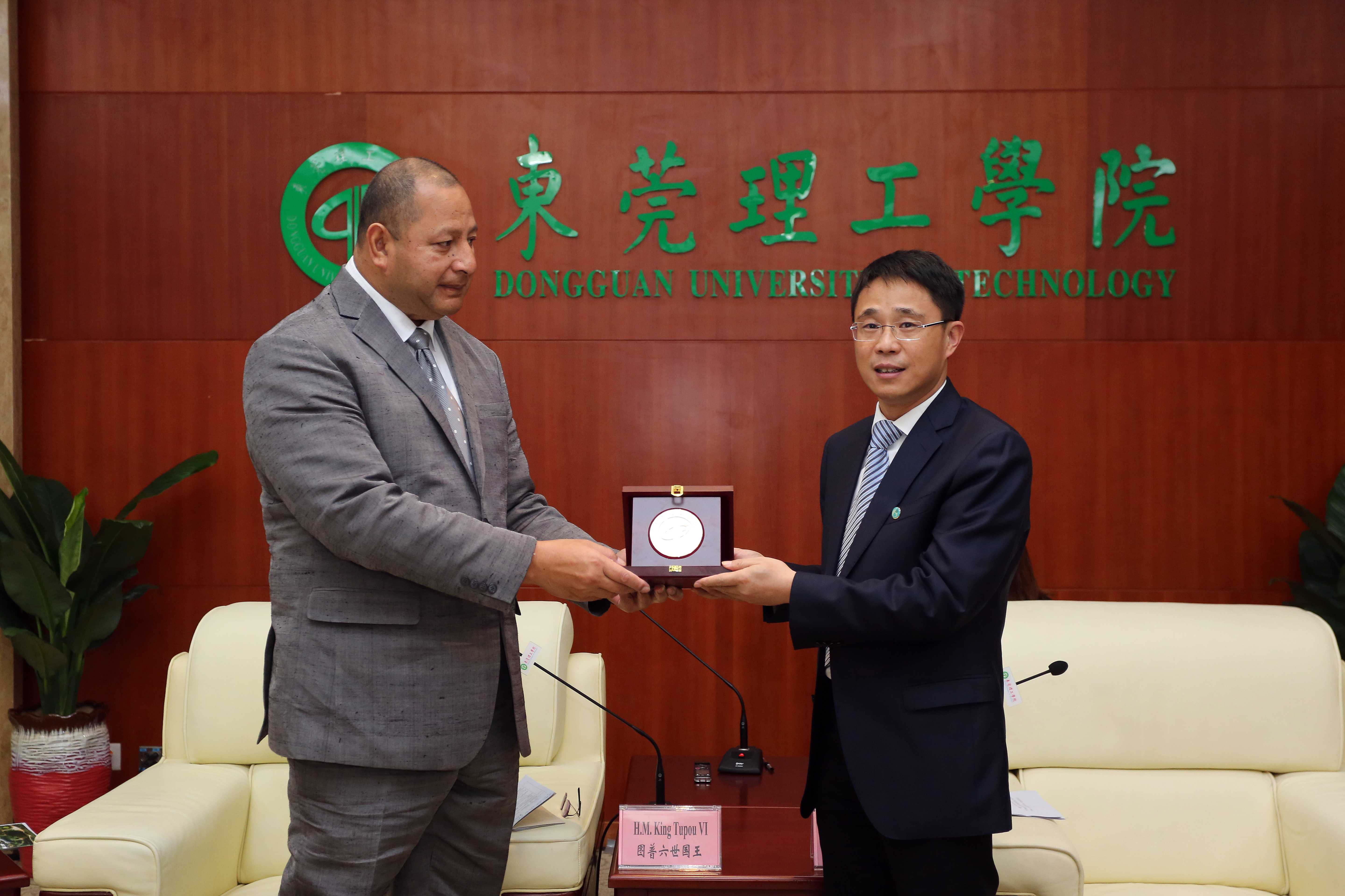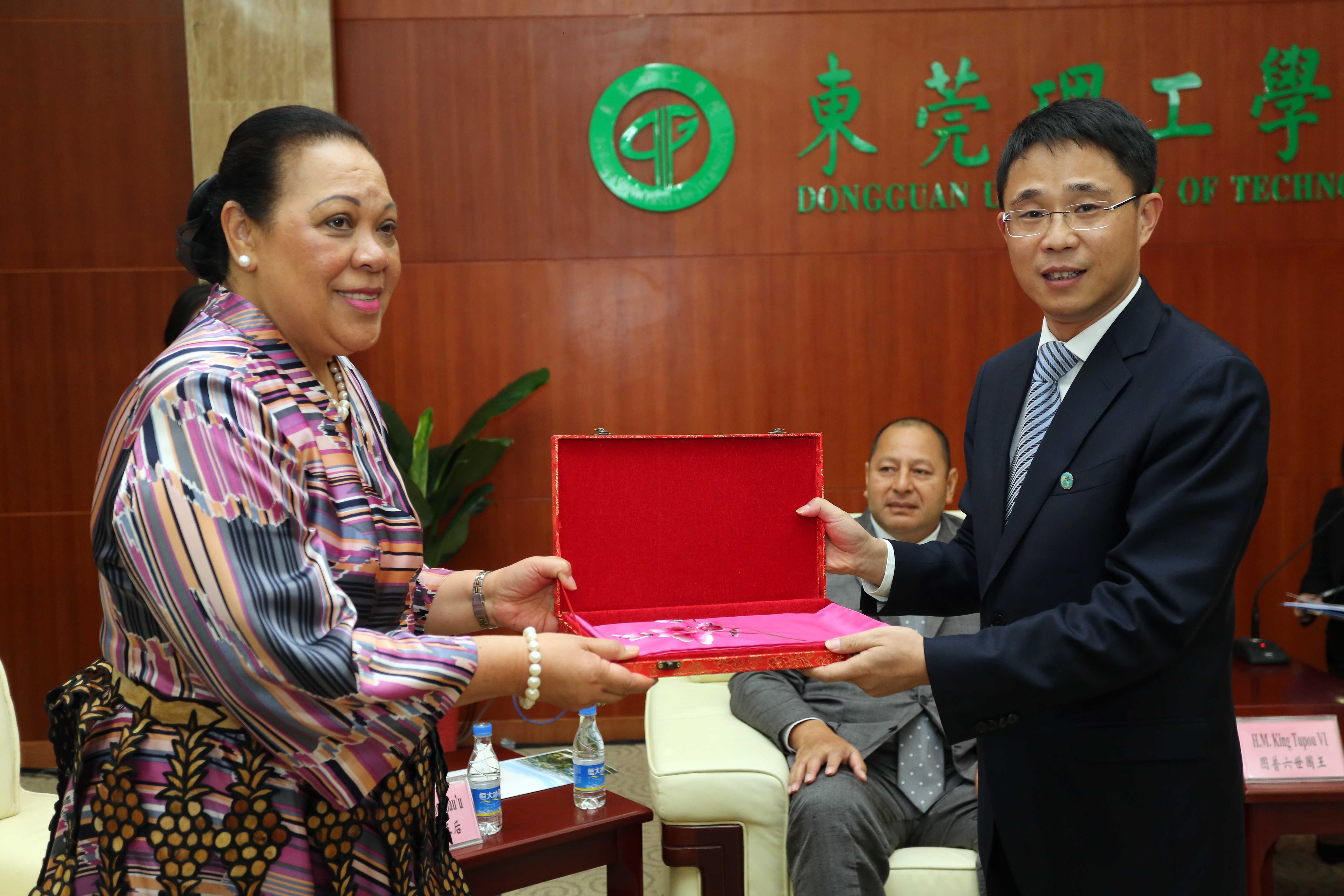 公司党委书记成洪波代表公司师生,对图普六世国王及王后的到访致以热烈的欢迎和衷心的感谢,并向图普六世赠送太阳城博彩校徽、向王后赠送粤绣丝巾作为纪念品。