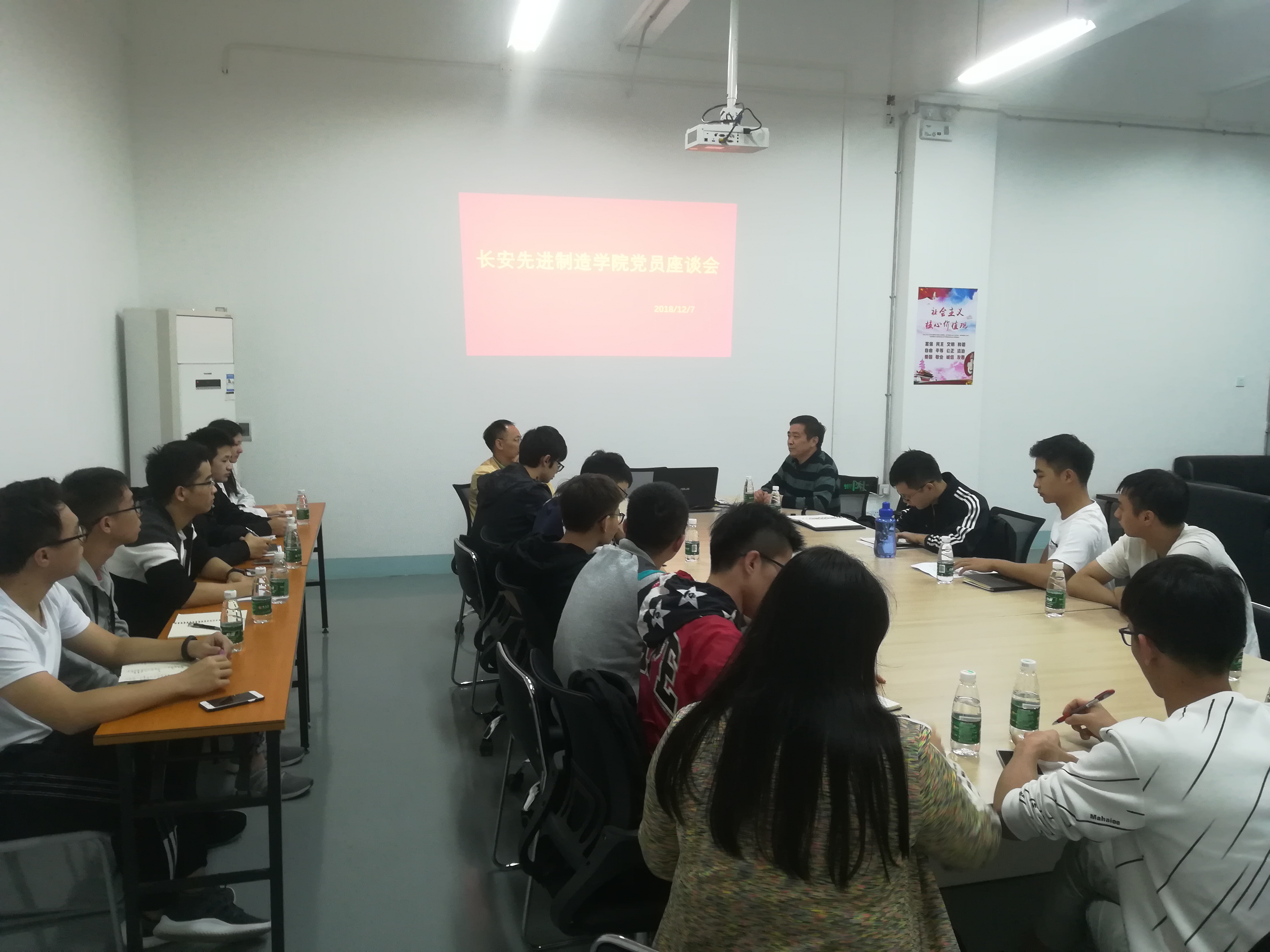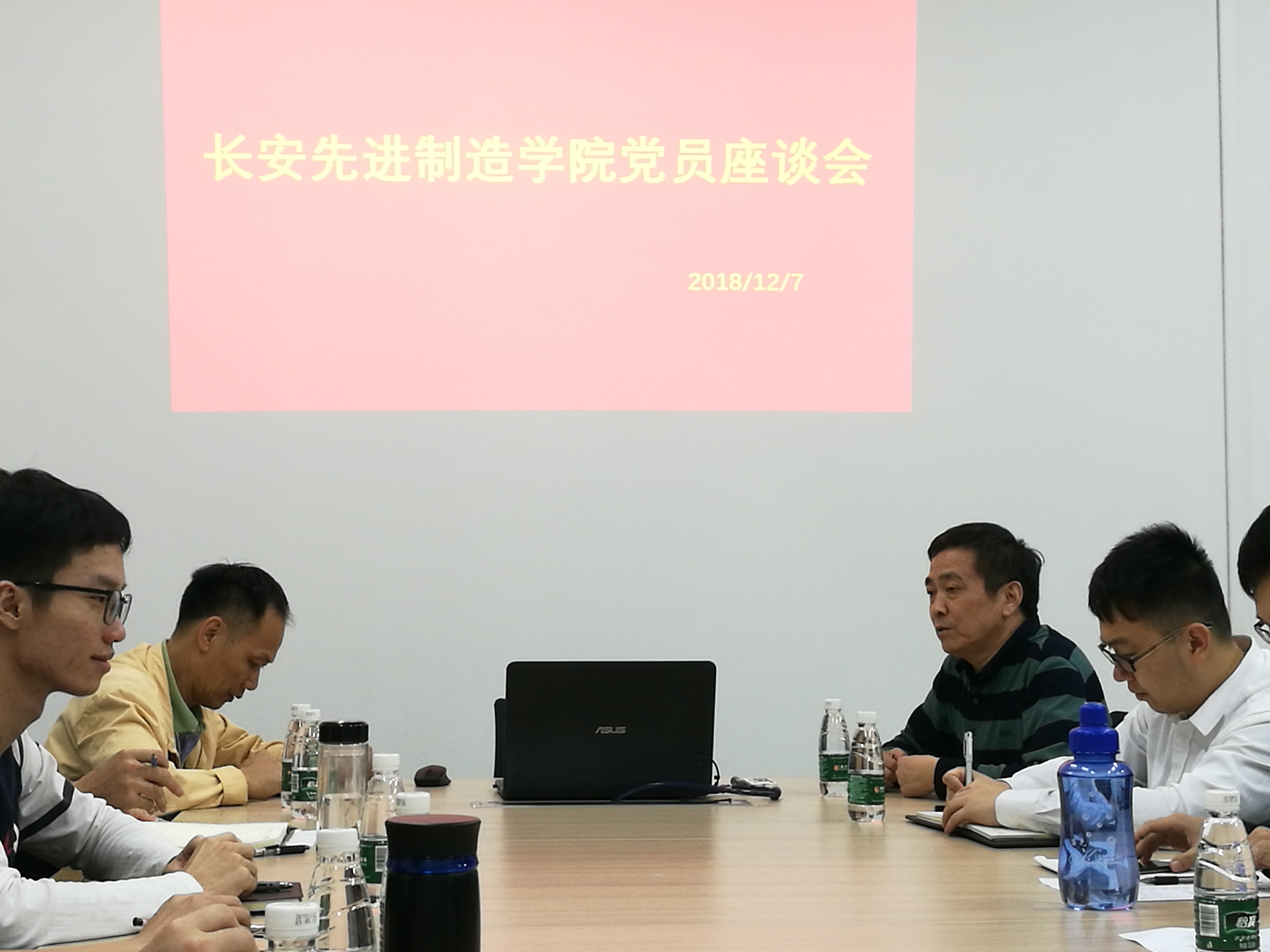 为深入学习贯彻习近平总书记视察广东重要讲话精神,2018年12月7日下午,太阳城娱乐在长安先进制造公司教学楼211会议室召开员工党员座谈会。出席人员包括公司党总支书记钟守炎教授、党总支副书记陈举铭老师、辅导员罗嘉楠老师和2015级全体员工党员。