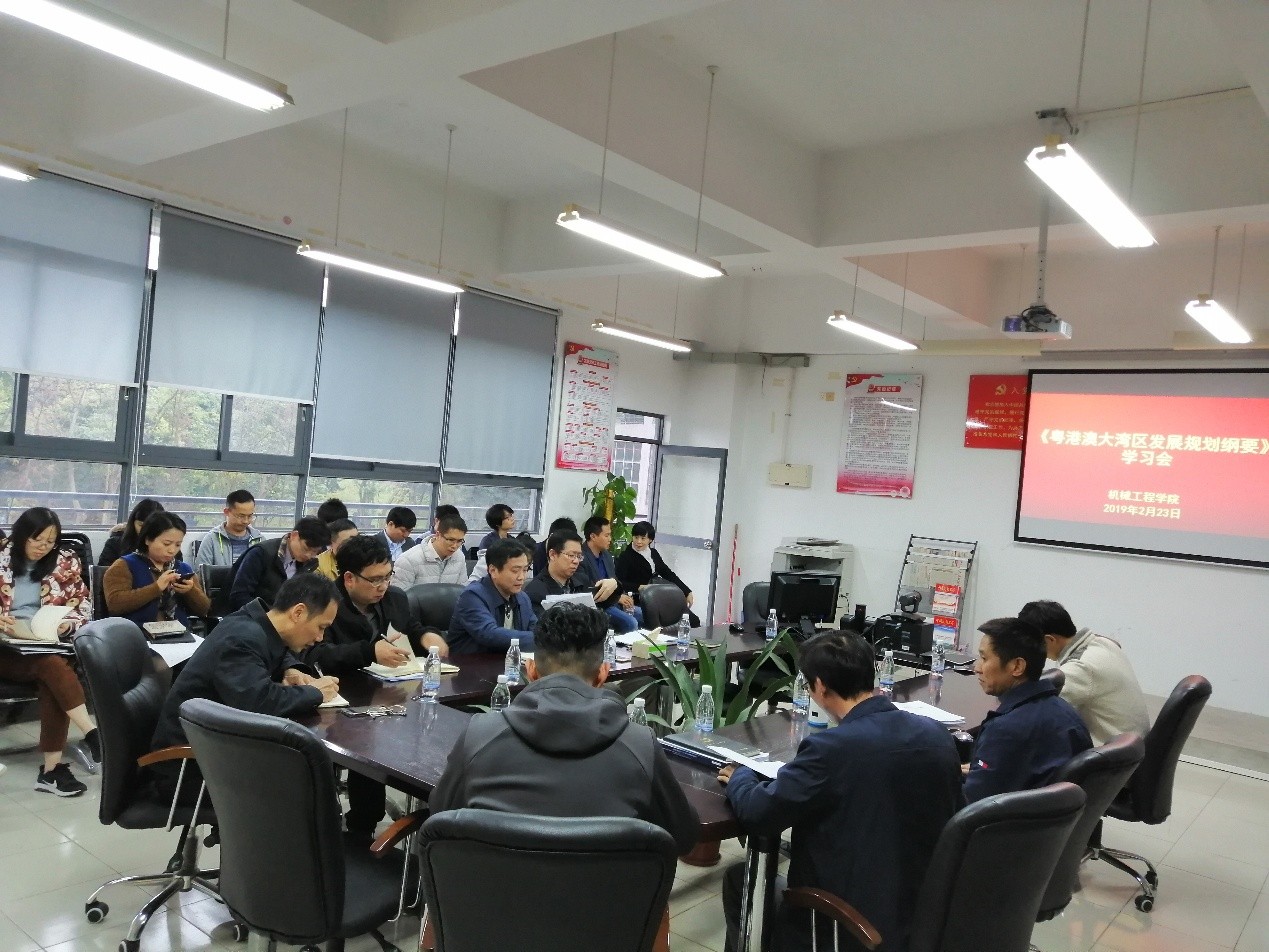 2019年2月23日下午,太阳城娱乐在机电楼12A204会议室召开《粤港澳大湾区发展规划纲要》(以下简称《纲要》)学习会。出席人员包括院领导、各系、中心主任和员工辅导员,会议由党总支书记钟守炎主持。