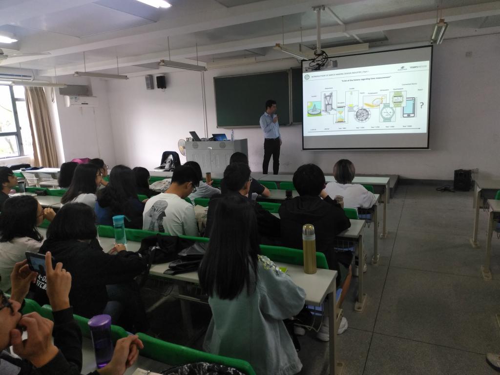讲座交流分为五个环节:第一环节,设计师Diego简单介绍了自己的学习、从业背景。第二环节,设计师Diego简明扼要地介绍了计时器的发展历史。第三环节,设计师Diego介绍了计时器——钟表发展演变进程中具有代表性的产品。第四环节,设计师Diego交流分析了几大腕表品牌经典产品的设计风格,倡导同学们重视细节的思考与推敲。第五环节进行交流互动,设计师为大家提供了三款腕表方案,让同学们现场设计它们的表带,由设计师筛选出三名同学的方案作交流探讨。