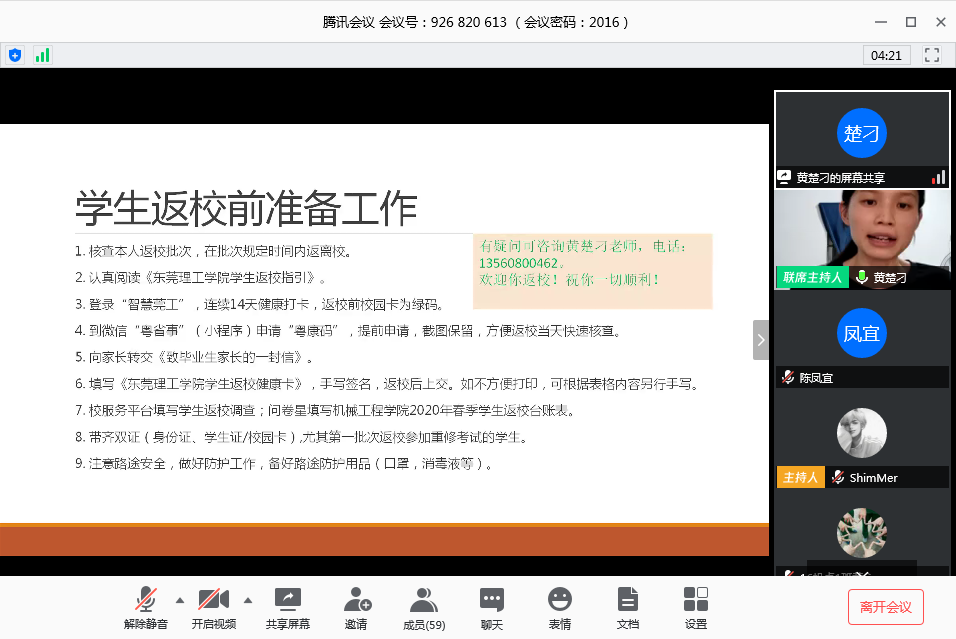 会上,黄楚刁老师传达了公司《太阳城博彩员工返校指引》文件精神及要求,强调员工返校前、返校当天、在校期间及离校前后各项工作内容与注意事项。提醒同学们按照公司要求按批次安全返校,提前做好“粤康码”、健康日报表打卡、疫情安全防护、《致毕业生家长的一封信》等工作。返校当天按公司要求有序进入公司,到校后严格执行“五个一律”要求,不串门、不聚集,每天自觉配合做好体温检测和身体健康报告,遵守社区、食堂、实验室、活动场所、个人健康的相关制度与管理,时刻做好个人防护工作。