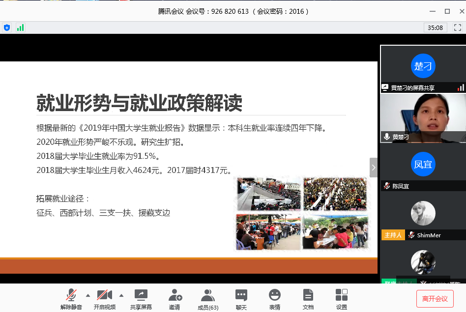 随后,黄楚刁老师解读了目前的就业形势与就业政策,建议同学们可以拓展就业途径,如征兵入伍、参与西部计划、三支一扶、援藏支边等。