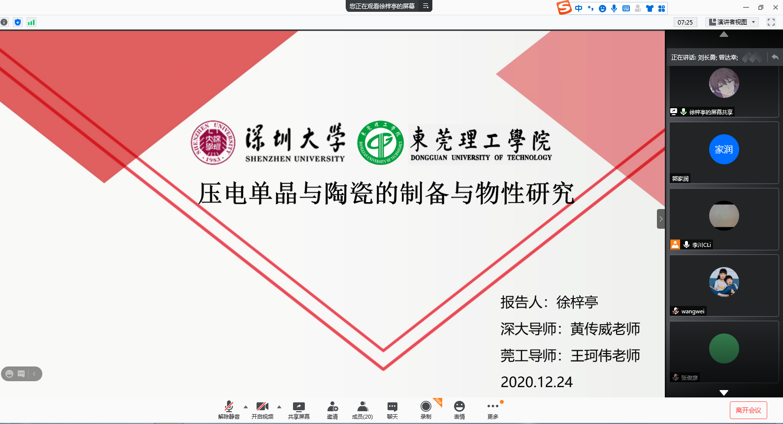 来自广东工业大学、深圳大学的24名2019级东莞基地联合培养研究生分两组就其学术研究进展进行汇报;与会导师对研究生的工作进行了提问和点评,提出改进意见。