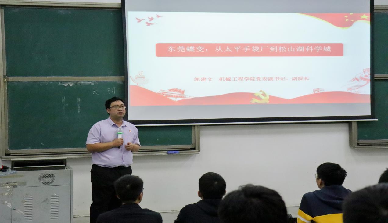郭建文分享了东莞自改革开放以来的发展,讲述了东莞如何从太平手袋厂到松山湖科学城的蝶变,东莞从追赶时代到走到前沿、从“世界工厂”到科技栖息地、从“鱼米之乡”到“生态都市”,敢为人先的东莞人,坚持改革开放,坚持走中国特色社会主义道路,做到真正的“海纳百川,厚德务实”。