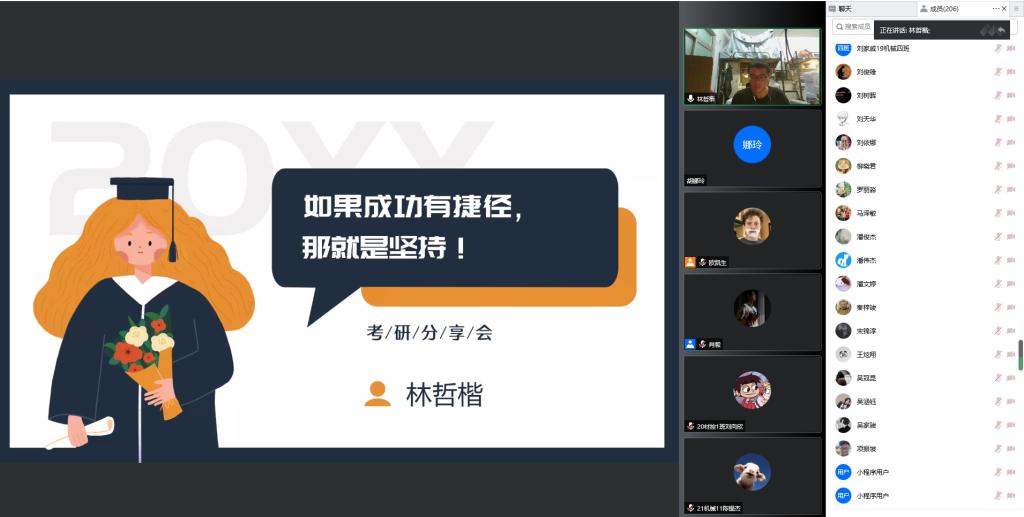 随后,2022届成功考上研究生的同学分享自己的备考、复试等经历。他们从科目时间安排、考研资料推荐、备考方法、院校选择、复试技巧等方面入手,以小见大,和大家分享自己的考研经验和心路历程。林泽楷同学表示:“在进行研究生考试备考的同时,需注意个人的心理情况,要劳逸结合,定时进行定量的体育锻炼,有助于提高学习效率。”接着,员工赵永志分享了考研全年大事记以及考研前在大学学习中需要完成的事,助力同学顺利考研。