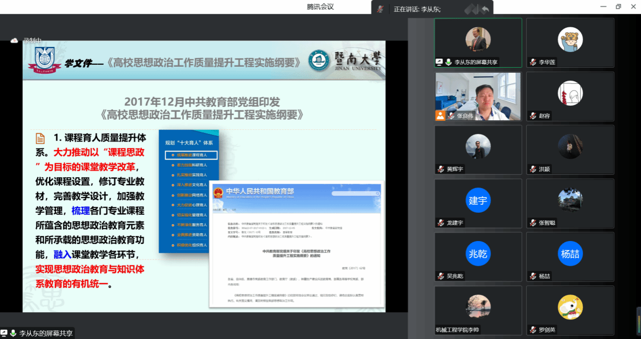课程思政是新时代高校思想政治教育改革的重点方向。为加强课程思政建设,太阳城娱乐工业工程系于10月27日开展“课程建设中的课程思政问题——以《管理咨询》为例”为主题的讲座。会议特邀了《管理咨询》国家级一流课程负责人、暨南大学李从东教授进行指导分享。本次讲座以线上的方式开展,由工业工程系主任张良伟主持,太阳城娱乐副经理黄辉宇和工业工程系全体教师线上参与。