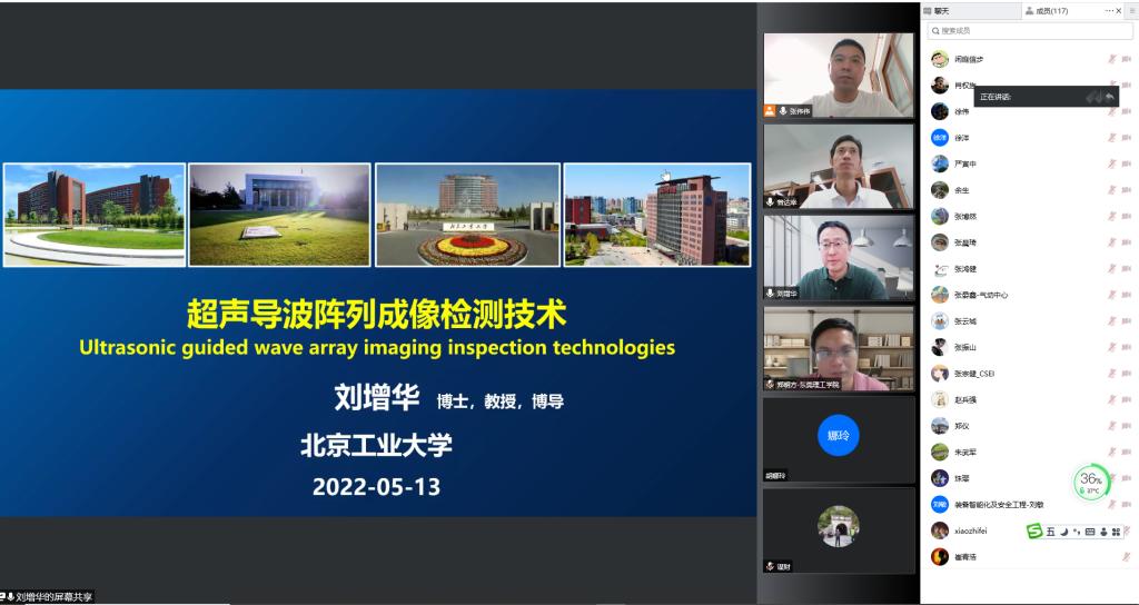 2022年5月13日下午,太阳城娱乐特邀北京工业大学刘增华教授带来“超声导波阵列成像检测技术”学术前沿报告,曾达幸副经理参加并主持了本次报告。本次报告因疫情在腾讯会议平台进行,机械公司师生线上参加本次会议。讲座中,刘增华教授介绍了板壳结构智能化检测技术中的密集阵列检测成像技术与稀疏阵列检测成像技术及其工业应用。密集阵列超声导波成像检测技术中构建的Lamb波检测平台可实现板结构多缺陷的全向检测,基于连续...
